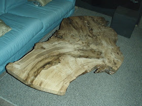Remember this slab? It was a real odd ball 2" slab that was laying around the shop for a few months. After receiving the new load of Australian slabs, we decided to take this one and make a Coffee table. We trimmed the edges so it would fit better in the living room it was going into and constructed a base out of a very dense piece of Balsa Lumber we had here at the shop.